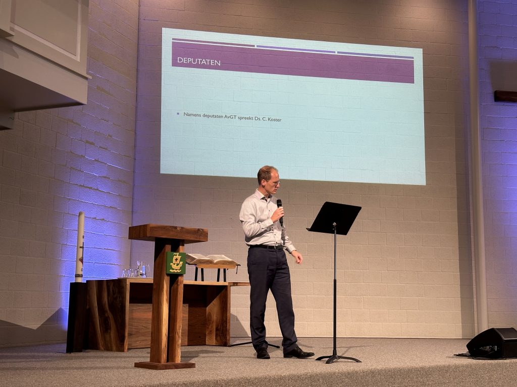 Het woord ging vervolgens naar Ds. C. Koster namens de deputaten AvGT. Na het openingsgebed stond hij stil bij de huidige situatie aan de AvGT. Een korte samenvatting: Tiemen van Bale heeft zijn studie recent afgerond, terwijl er daarnaast zowel beginnende als gevorderde studenten actief zijn aan de academie. In het docentenkorps hebben veranderingen plaatsgevonden; huidige docenten zijn onder meer Ds. L. Heres, Ds. J.R. Visser, Dr. A. Bas en Dr. V.E. d’Assonville, en er zijn diverse gastdocenten zoals ds. B. van Egmond en ds. H.T. Wendt. Momenteel bereiden de deputaten zich voor op de komende synode, waar belangrijke ontwikkelingen zullen worden besproken. Ds. Koster eindigde met een oproep tot gebed voor de opleiding.