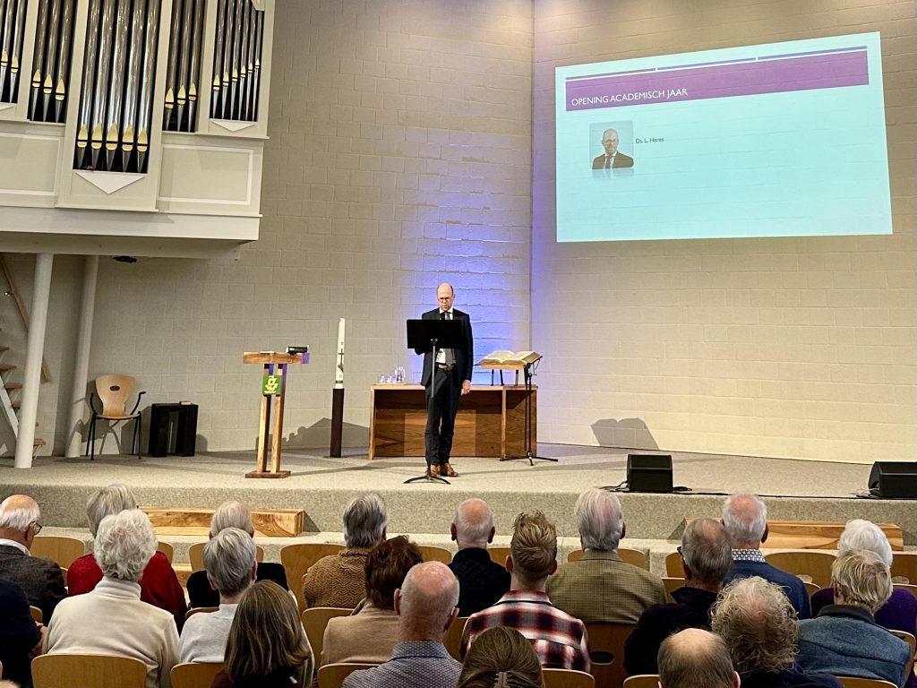 Het volgende programmaonderdeel was het openingsreferaat door Ds. L. Heres. Hij reflecteerde op het scheppingsverhaal, aan de hand van Gen 1:24-2:9, en vroeg zich af of dit vandaag de dag nog als actueel gezien wordt. Volgens hem vraagt wetenschappelijke Bijbelstudie altijd om een nederige, ontvangende houding. Hij benadrukte dat Gods almacht en menselijkheid samenkomen in Christus, de tweede Adam, en dat wij zonder eigen kennis van de wereld vóór de zondeval moeten vertrouwen op wat God ons in Zijn Woord heeft geopenbaard. Na deze bijdrage opende Ds. Heres officieel het academisch jaar.